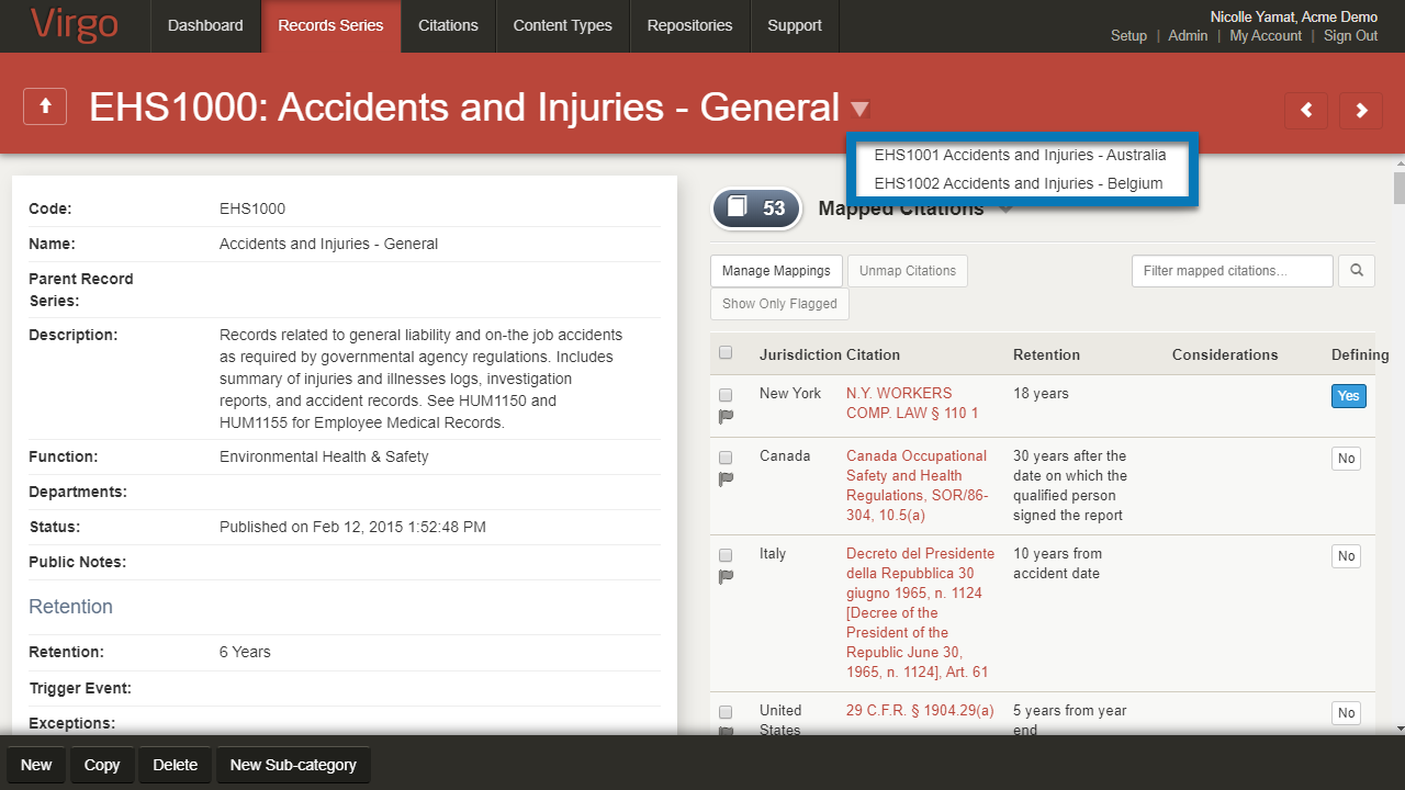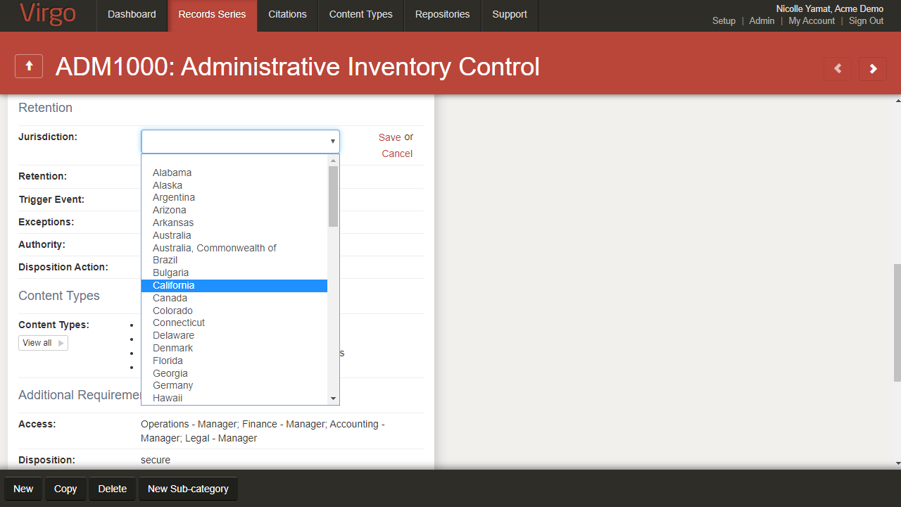 The Jurisdiction field also displays the new term for any record series applied to all jurisdictions.