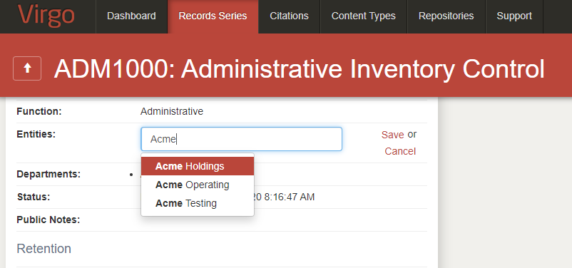 To view Entities field within the record series detail view, hover your mouse over the image.