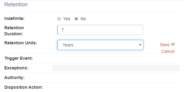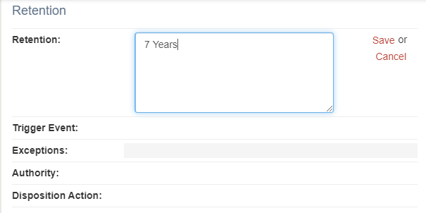 Select Yes to make the Retention field a free text field on the record series detail screen. Select No to replace the Retention field with these fields: Retention Duration and Retention Units.