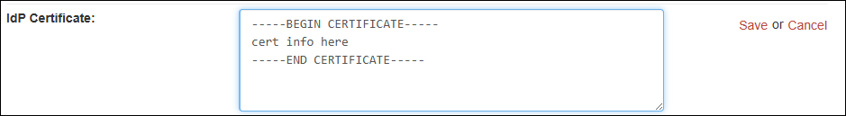 In the IdP Certificate field, replace the old certificate information with the new certificate information. Include the Begin Certificate and End Certificate statements.