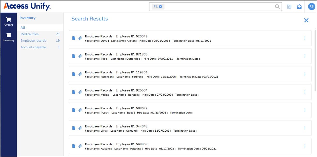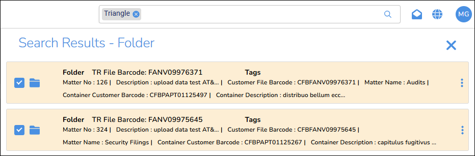 When you search for records, the Search Results page displays the records in a configurable card format. The cards now display more information.